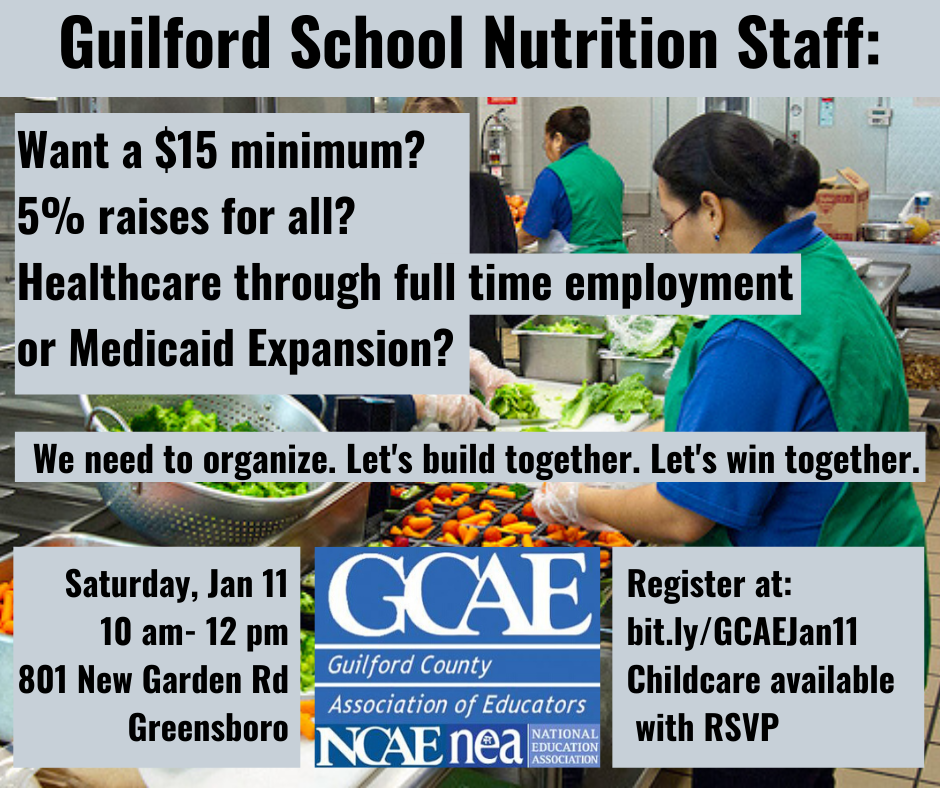 All GCS School Nutrition Staff are invited to a planning meeting with the Guilford County Association of Educators this Saturday, January 11 from 10 am- 12 pm, at 801 New Garden Rd, Greensboro, NC 27410.