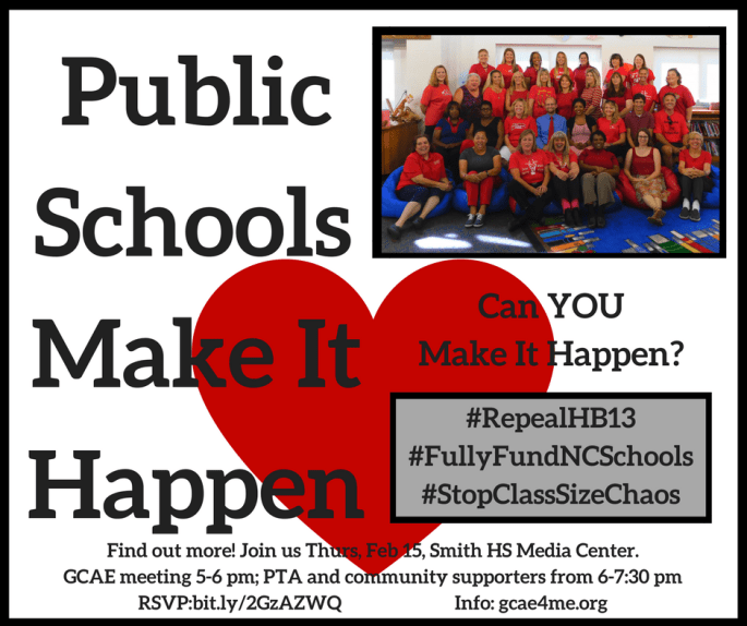 The Guilford County Association of Educators (GCAE) monthly Member Meeting is coming up on Thursday, February 15. Join us as we launch our spring Make it Happen! campaign. We will start with GCAE business at 5 pm and break for dinner at 6 pm as PTA and community members join us to find out how we can work … Continue reading GCAE and PTA Make it Happen! Join us Feb 15 for our Spring Campaign Launch!